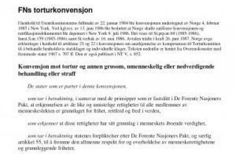 FNs torturkonvensjon ble vedtatt i 1984 og trådte i kraft i 1987. Konvensjonen består av 33 artikler, og har som formål å forby enhver form for tortur og annen grusom, umenneskelig eller nedverdigende behandling eller straff.