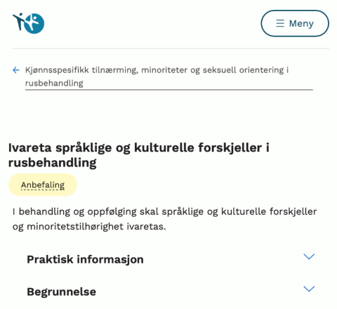 Helsedirektoratet sin nettside om å ivareta språklige og kulturelle forskjeller i rusbehandling. Her finner du kulturformuleringsintervju for helsepersonell for å sikre god og likeverdig helsehjelp.